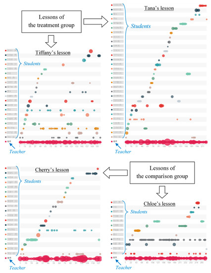 After the program, we observed differences in the classroom practices of the treatment group (i.e., Tiffany and Tana) and the comparison group (i.e., Cherry and Chloe). Figure 4 shows the visual learning analytics of classroom videos of the four teacher participants toward the end of the program. The horizontal axis represents a lesson’s turn number and, on the vertical axis, each timeline represents a speaker. The students of the two treatment groups provided more responses (i.e., more bubbles in student timelines) than those of the comparison group (i.e., fewer bubbles in student timelines). More quantitative evidence is presented as follows.