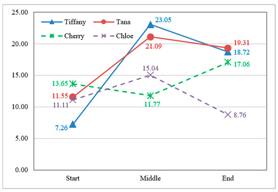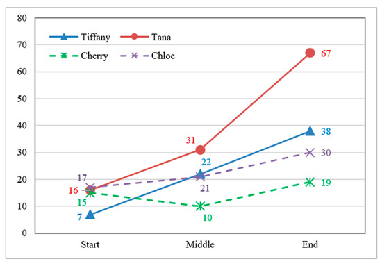 Figure 5 shows the number of talk moves of Michaels et al. [23] and Resnick et al. [24] by the four teachers over time. The treatment group showed an increasing trend. Specifically, Tiffany’s number increased from 17 to 31 and 67, while Tana’s increased gradually from seven to 22 and 38. Toward the end of the program, Tana’s (N = 67) use of productive talk moves were more than double Cherry’s (N = 19) and Chloe’s (N = 30). Although Tiffany (N = 38) used these talk moves slightly more than the comparison group, her improvement is worth noting because she used just seven productive talk moves at the start of the program.