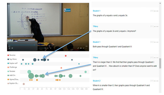 For this reason, we developed a visual learning analytics tool, the classroom discourse analyzer, to facilitate teachers’ reflections on classroom talk (see Appendix A for an interface; [12,30]). The analyzer can automatically visualize low-inference discourse information (e.g., distributions of words, turns, and turn-taking patterns) from transcriptions of classroom video-recordings, while human coding is needed for the analyzer to represent high-inference discourse information such as the types of talk moves shown in Figure 1. The analyzer visualizes classroom talk using (1) timelines of the teacher and each student and (2) bubbles of various sizes to represent the number of words in a talk turn. Graphs present information on classroom talk (e.g., speaker statistics, turn-taking patterns, and distribution of each productive talk move), and teachers can click on the graphs to navigate and view details in the corresponding video segments and/or transcripts. Visual representations, transcripts and video footage are synchronized, providing multiple resources for supporting teacher reflections and discussion. The use of the classroom discourse analyzer follows the principles of multiple views in information visualization [31] and the visual information seeking mantra—“Overview first, zoom and filter, then details-on-demand” [32] (p. 366), which are consistent with human information processing rules, such as focusing from general to specific.