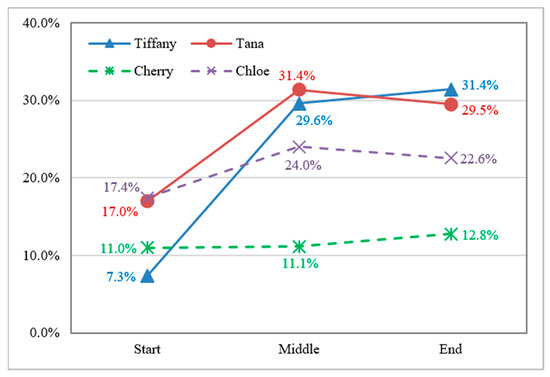 As Figure 7 shows, the percentages of students’ word contributions in the lessons were low in both groups at the start of the program and ranged from 7.3% to 17.4%. Starting from the middle of the program, the percentages of student responses in the treatment group increased by about 15% to nearly 30%. This level of word contribution was sustained toward the end of the program, in contrast to 22.6% (Chloe) and 12.8% (Cherry) in the comparison group.