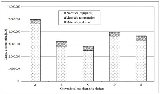 Life cycle energy consumption; (A) reference design, (B–E): alternative strategies.