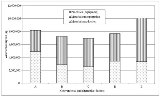 Life cycle water consumption; (A) reference design, (B–E): alternative strategies.