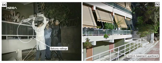 Example of an indoor fatal incident in 1994, in the suburb of Heraklion in Athens, Greece. The building was depicted in 1994 with TV news imagery showing the deceased carried out of it (a) and was identified through the reported address and its characteristics (e.g., balcony railings). The building was also photographed in 2021 for comparison purposes (b).