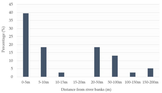 With regard to their distance from the river course, most of the FBs (60%) were found within 15 m from the riverbanks, whereas 40% of them were situated between 20 m and 200 m from the riverbanks (Figure 2).