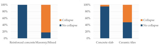 Distribution (%) of FBs according to the flood effect, i.e., whether the FB collapsed or not, per building material (left) and roof type (right).