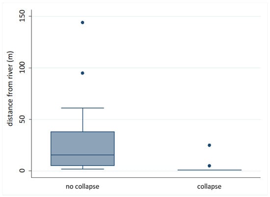 Distribution (box plot) of the distance from the river, over the dichotomous variable of flood effect on the FB, i.e., whether the FB collapsed or not.