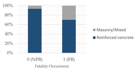 The results show statistically significant correlations for the number of floors (Spearman’s rho = −0.44, p < 0.001) and the building material (Cramer’s V = 0.30, p < 0.05) with fatality occurrence. As shown in Figure 5, the percentage of M (masonry/mixed) type buildings was significantly higher in the sample of FBs (30%) than in NFBs (7%).