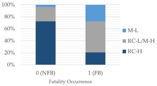 To further examine the effects of these two important parameters, namely materials and number of floors, we also estimated their synergistic effect on fatality occurrence. For this analysis, the continuous variable number of floors was converted to an ordinal variable named building height, which had two categories, coded as 1 for high buildings (H) with more than 1 floor and 2 for low buildings (L) with 1 floor. The variable building material was also coded as 1 for RC and 2 for M type. The synergistic effect of building material and height was then derived from the multiplication of the two coded variables. The Pearson Chi-square correlation between the synergistic variable of material–height and fatality occurrence (58 observations) was found to be significant (p < 0.001) and strong (Cramer’s V = 0.54). As Figure 6 shows, most of the NFBs were reinforced concrete (RC) and higher (H) than 1 floor (RC-H = 72%), while the percentage of such buildings in the FBs was significantly lower (RC-H = 21%). Conversely, the percentage of buildings that combined masonry/mixed type (M) and low height (L) was very small in the NFBs (M-L = 3%) and significantly higher in the FBs (M-L = 28%).