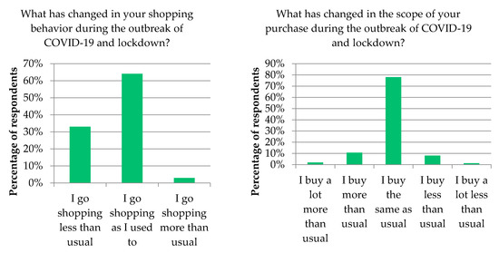 In terms of shopping behavior, as indicated in Figure 2, 33% of the respondents reported making fewer grocery-shopping visits than usual during the pandemic, while 64.09% of the respondents shopped as they used to, and only 2.9% of the respondents went shopping more than usual. Regarding the changes in the scope of purchases since the outbreak of COVID-19, 12.67% of the cohort reported purchasing more and a lot more than usual on each trip (encompassing “a lot more” and “more” response choices). In addition, 9.28% of the cohort indicated that they buy less or a lot less than usual. However, 78.04% said they did not alter their behavior and continued to buy as usual.