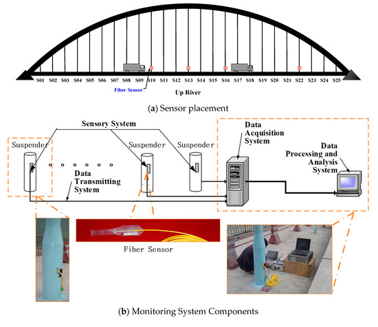 The E’Bian bridge, as shown in Figure 1, is a half-through concrete-filled steel tube (CFST) arch bridge located in China. The main span is 138 m and the width is 13 m. The arch rib is made of CFST with 50 suspenders connected to the concrete deck. A vehicle load effect monitoring system was implemented on suspenders on this bridge, as shown in Figure 1. The monitoring system can collect the traffic load effect data through the fiber sensor installed on the steel wires of the suspenders (Figure 1).