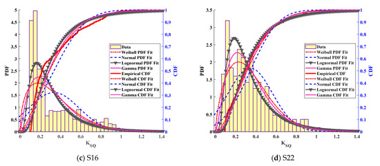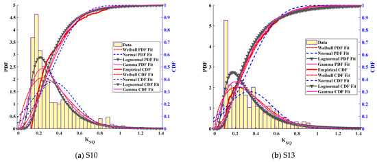 Figure 2 illustrates the distribution of traffic load effect on four suspenders (S10, S13, S16, and S22). KSQ = SQ/SK, where SQ is the real stress on the suspender steel wires and SK is the normal value of the traffic load effect calculated by the design code. It can be observed in Figure 2 that the Weibull distribution, normal distribution, log-normal distribution, and gamma distribution, which are recommended in the Unified Standard for Reliability Design of Highway Engineering Structures (GB/T 50283-1999) as the traffic load effect model, deviate from the empirical distribution for the multi-peak phenomenon.