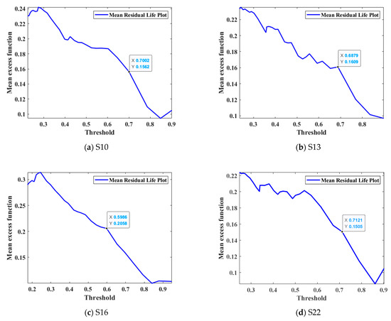 Threshold selection is an important step in the application of the POT method. An appropriate threshold is critical for estimating the EV distribution [33,43]. To choose an appropriate threshold, the mean excess function (MEF) [44] of the GPD is defined as follows: