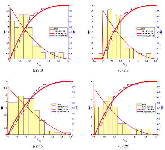 According to the EVT, the previous distribution, , belongs to the GPD family if the threshold is large enough. The GPD, which has been proven to be the limit distribution of scaled excess over high threshold values, is often used to fit the upper tail of the probability distribution [33].The cumulative distribution function (CDF) of the GPD is defined as follows: