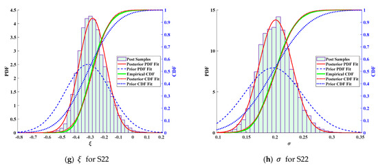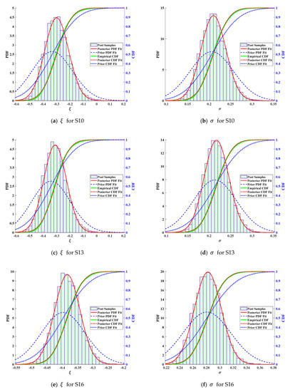 - EvaluateSince the GEV distribution parameters can be calculated by GPD distribution parameters (see Equation (11)), only need to be chosen as the model parameters . At the beginning, several methods can be used to evaluate the original , such as Jeffreys prior of flat priors, even if no monitoring data are obtained. When the new monitoring data are gathered, the previous posterior distribution becomes the new priors.