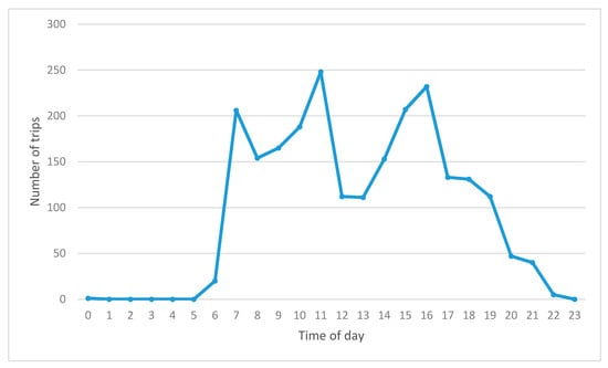 The demand data were obtained from a previous study [45] in terms of the average number of trips handled by SAVs from an origin to a destination with a zone size of 250 m-mesh. The researchers [45] processed three types of data, namely the mobile phone movement history data from a Japanese telecommunications operator called KDDI, the Person Trip Survey data of the Metropolitan Area of Chukyo (PT data of Nagoya Metropolitan) [46], and the stated preference (SP) data of the residents’ willingness to use the Slocal Automated Driving collected by a questionnaire survey. The PT data of the Nagoya Metropolitan area provide information on the number of personal trips with trip purpose and travel mode between five small zones in the town. Conversely, the KDDI’s mobile phone movement history data can provide the number of trips without trip purpose and travel mode information between 250 m-mesh zones in the town. The combined PT/KDDI data and SP data were used to estimate the travel mode choice model, referred to as the RP/SP combined multinominal logit model. Based on the model results, the demand was calculated when the SAV cost was 200 JPY per km (approximately 1.8 USD). In the case of simulation, the number of trips between the zones was randomly obtained using a Poisson distribution [9,32,35] based on the demand data’s hourly average number of trips [45]. Ten sets of demand data were prepared, wherein the total number of trips varied from 2197 to 2331 with an average of 2263 and a distribution as illustrated in Figure 2. The total number of trips per day in the PT data was 29,495 [45], which implies that 10% of these trips use SAVs.