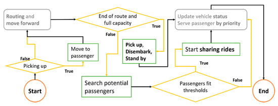 In the simulation, one step of the simulation is assumed to represent one second in real-time, and it repeats until the end of the operating time (1:00 a.m.). Simulation executions are performed within a single step, including the timely generation of passengers’ requests, vehicle operation, and related data recording. Meanwhile, the status of agents continues to interfere and change; for example, vehicles update their status to stand-by, search sharing rides, and canceling service. These interfering behaviors are based on preprogrammed rules, such as dispatching strategies and sharing methods written in Visual Basic.