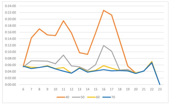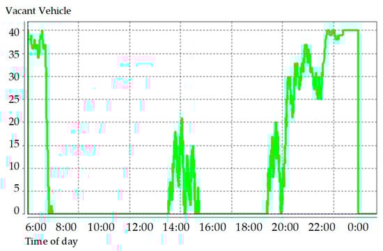 Figure 6 illustrates the vacant vehicles at different times of the day. As indicated in the figure, the insufficiency of the fleet explicitly occurred both in the morning and afternoon. In the low-speed scenario with 40 vehicles, the entire fleet was occupied during approximately 7:00–13:30 and 15:00–18:30.