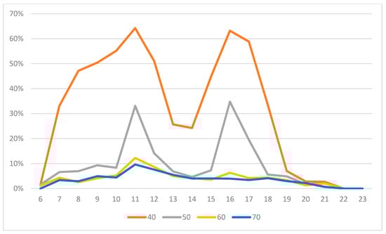Furthermore, the hourly wait times and share rates during the day are important from the operating company’s perspective. Together with various fleet sizes, they may also offer some constructive ideas. Figure 4 and Figure 5 indicate that the hourly wait time and share rate, respectively, fluctuate based on the time of day, and significantly increase at 11:00 and 16:00 to match the demand.