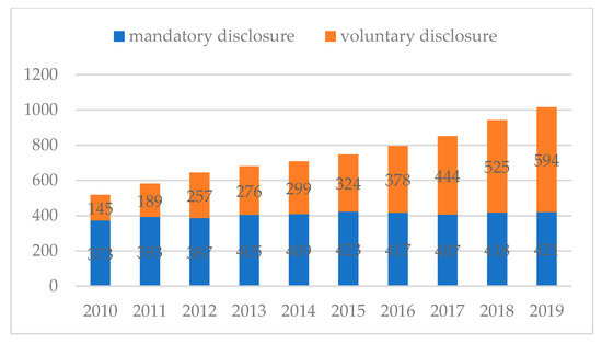 Aside from the knowledge of the overall trend in CSR reporting of Chinese listed companies, it was interesting to determine the portion of the published reports that resulted from introducing mandatory CSR reporting regulations in China. The results of analysis revealed that the number of voluntarily disclosed CSR reports in 2010 was only 145, which is less than half of the number of the CSR reports that were mandatorily disclosed. However, the number of voluntarily disclosed CSR reports in 2017 exceeded the number of mandatorily disclosed CSR reports for the first time, and this trend continued in 2018 and 2019 (see Figure 2). The results may indicate that more and more Chinese listed companies are aware of the importance of CSR reports and are therefore willing to voluntarily disclose CSR reports.