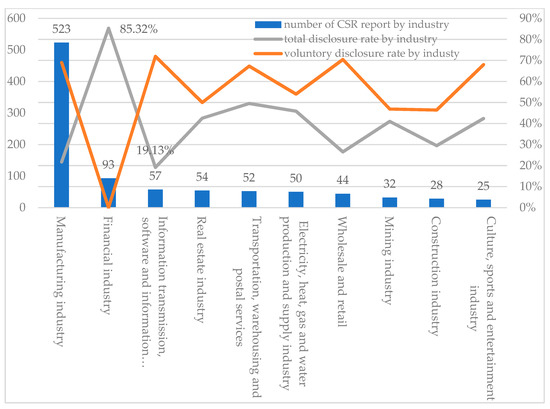 The analysis of the distribution of CSR reports among industry sectors showed that the industry that discloses the most CSR reports among Chinese listed companies in 2019 is the manufacturing industry (see Figure 3). The financial industry follows closely behind with 93 CSR reports. The next four industries only have more than 50 CSR reports. In the tenth-largest industry, only 25 CSR reports have been released. At the same time, it can be seen that in terms of the total disclosure rate of CSR reports in each industry (as shown by the grey line in Figure 3, which is equal to the total number of CSR reports issued by each industry divided by the total number of Chinese listed companies in the corresponding industry), the financial industry ranks first, reaching 85.32%, while the information transmission, software, and information technology service industry ranks last with only 19.13%. In addition, among disclosed CSR reports, the voluntary disclosure rate of CSR reports (as shown by the orange line in Figure 3, which is equal to the number of CSR reports voluntarily issued by each industry divided by the total number of CSR reports in the corresponding industry) in the financial industry is the lowest, at 0%, while in other industries, the rate remains within the range of 45–75%.