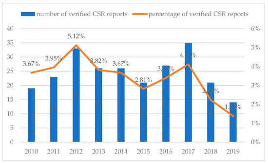 Second, among the disclosed CSR reports, the number and percentage of verified CSR reports are low. The verification of the CSR report is a strong guarantee of its credibility [61,62]. According to the Federation of European Accountants, “CSR reporting without the authentication of the veracity of the disclosed data is rightly deemed as worth little more than advertising activities” [63]. Therefore, unverified CSR reports greatly reduce their credibility. As a result, a large number of unverified CSR reports leads to the lower overall credibility of CSR reports of Chinese listed companies. After sorting out regulations related to CSR, it can be found that there are no clear requirements for the verification of CSR reports. Therefore, in order to improve the credibility of CSR reports of Chinese listed companies, the government needs to issue relevant regulations on “the independence of the assurer, the content of the assurer’s report, and the nature of what is being assured” [64] to ensure that the purpose of CSR report verification is better achieved, rather than as a symbolic practice [64].