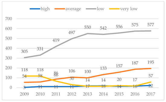 Beginning from 2009 to 2017, the number of CSR reports at all levels except the very low level increased (see Figure 5). Secondly, the number of CSR reports with a high degree of disclosure is always small, and CSR reports with an average degree of disclosure are not the main body while most CSR reports are at a low disclosure level.