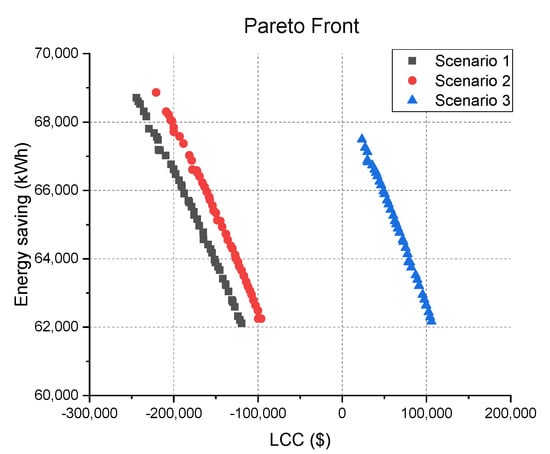 | Hong et al. [14] | NSGA-II algorithm | Minimum predicted mean vote for the building occupants’ indoor environmental quality acceptance level. Minimum initial investment cost. Minimum thermal energy consumption. Minimum net present value for the lifecycle economic value. Minimum global warming potential for the lifecycle environmental value. |