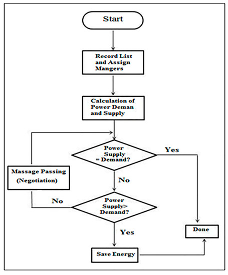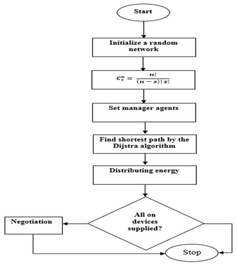 The DNsys code’s flow chart contains many phases; the first one contains start and initialization of network random parameter (space, energy, and static size of plot) (Figure 7). Setting the packet size and reading house temperatures were done through manager agents in the second phase. A run function calculation and the Dijkstra algorithm were executed in the third phase to determine the path for distributing energy between the first and last nodes. Finally, the result phase was presented by supplying energy to all devices or appearance of negotiation.