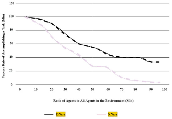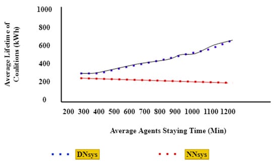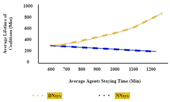 An environment was created as a network with sufficient resources; however, the staying time of each agent in the network differed. An agent may stay in the environment for a long period, while another might stay for a shorter period. Figure 9 shows the staying time for the DNsys and NNsys. The number of agents was increased to increase the average staying time.