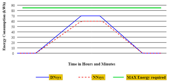 As shown in Figure 12, the DNsys reduces energy consumption by approximately 3% as compared to the NNsys. In the NNsys, the energy consumed is 10,380 kWh during operation time while, the in DNsys, it is reduced to 10,059 kWh. Also, the DNsys consumed 96.9%, saving about 3% of the overall energy, while NNsys consumed almost 100% of the total energy.