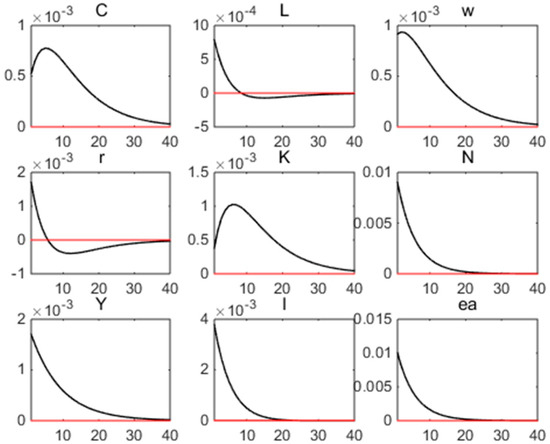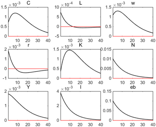 Figure 1 shows the impulse response after a 10% increase in clean energy technology. In Figure 1, the vertical axes mean the change ratio of the variable and the horizontal axes mean the periods after the shock. The increase in clean energy utilization will directly lead to an increase in energy input (N), deviating from the equilibrium state by approximately 1%. Moreover, the capital (K) and labor supply (L) are positively deviated from their equilibrium state by approximately 0.05%, and the range of change was lower than other variables. Over time, the capital stock (K) reached its maximum value in the 10th period, deviating from its equilibrium state by 0.15%, which was three times higher than its initial fluctuation. Investment (I) initially deviated positively by approximately 0.4% of its equilibrium state and has the highest deviation compared with other variables. The technological shock of clean energy will rapidly drive a substantial increase in investment levels, which is consistent with the situation in reality. Driven by the increase in investment level and energy input, the output (Y) has a positive deviation, which initially deviates from its equilibrium state by approximately 0.19%.
