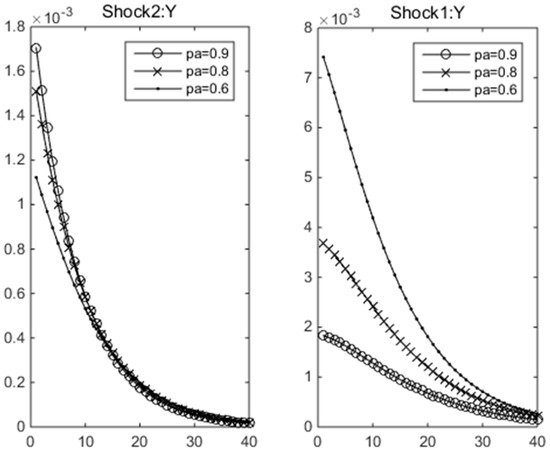 When shock2, namely, a non-clean energy technology shock occurs, the impulse response analysis of the output under different energy structures can be obtained. At the initial stage after the non-clean energy technology shock, the changes in the environmental pollution in different energy structure situations are very close, with almost no difference. In the mid-to-late period after the non-clean energy technology shock, when non-clean energy accounts for 60%, the decline in environmental pollution is lower than that in the other two situations. This result means that the technological advancement of non-clean energy is conducive to the growth of total output (Y) and thus promotes the rise of pollution control expenditures. However, the negative effect of high pollution emissions caused by the use of non-clean energy on the environment is greatly evident. Therefore, the efficient management of environmental pollution requires the optimization of energy structure, and blindly pursuing the progress of energy technology is not feasible.