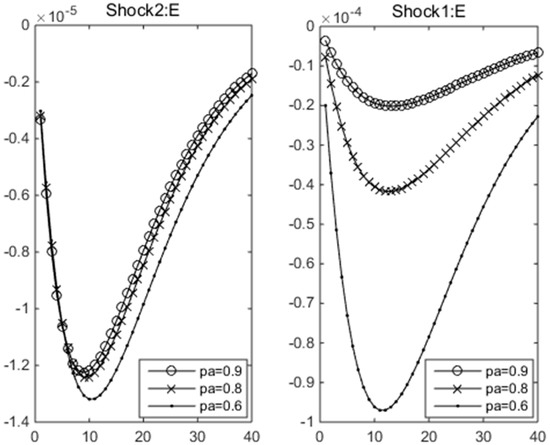 Figure 4 shows the impulse response result of environmental pollution (E). It can be found that Figure 2 and Figure 4 have similarities and differences in characteristics. In terms of similarities, technology shocks of both energies have a negative effect on the amount of environmental pollution. After a certain period of time, the negative deviation of environmental pollution from the steady-state value reaches the maximum.