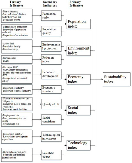 The sustainability index mainly includes three elements; namely, economically, socially, and environmentally sustainable development. Among them, economic sustainable development mainly considers economic development and technological progress, and socially sustainable development includes social and population elements. Finally, the first-level indicators are established as economy, society, environment, population, and technology. The ability of macroeconomic sustainable growth is comprehensively measured through these five indexes. The sustainability index constructed in this study includes 29 tertiary indicators, 10 secondary indicators, and 5 primary indicators, as shown in Figure 7.