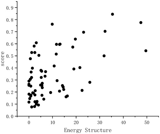 After calculating the sustainability index score of each country, we selected the proportion of clean energy and the national sustainability index scores of 68 countries in 2017 to draw a scatter diagram, as shown in Figure 8.