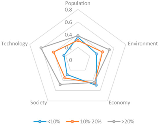 According to the classification of energy structure in impulse response analysis, the proportion of clean energy can be divided into three ranges: ≤10%/10–20%/≥20%. Among the 68 countries in the sample, 44 countries (64.7%) with clean energy are at less than 10%, 15 countries (22.1%) with clean energy are at 10–20%, and 9 countries (13.2%) with clean energy are at more than 20%. We analyze the five primary index scores in the three ranges to further compare the differences in sustainable development capability under different energy structures, and Figure 9 is obtained.
