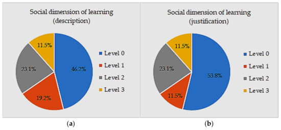 Regarding the theoretical justification (Figure 1b) on which these descriptions are based, it is seen that 53.8% of the groups (14 out of 26) did not present any evidence of justifying with respect to social interaction as a learning principle. Amongst the other groups, 11.5% (3 of 26) made a reference to some of the elements they had previously described in a vague and superficial way. A satisfactory level of achievement (levels 2 and 3) was obtained by 34.6% of the groups (9 out of 26). Of those 9 groups, 23.1% (6 out of 26) referred to them in-depth, relating the elements described to the work of the main authors used in the subject, while the justification of 11.5% (3 out of 26) was excellent. Those 3 groups were also capable of formulating constructive criticism. In Figure 1a, it is observed that 46.2% of the groups (12 out of 26) did not make a general description of the principle of social interaction the groups identified. In their reports, they did not include any descriptive elements with regard to the general sense of social interaction as a learning principle.