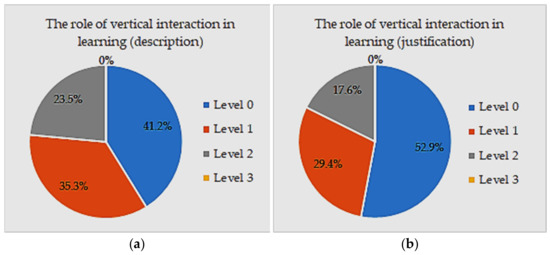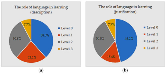 As far as the description of the role of language in learning (Figure 2a) is concerned, 61.6% of the groups (8 out of 13) did not obtain a satisfactory level of achievement (levels 0 and 1). Amongst them, 38.5% (5 out of 13) did not present any descriptive element of the value and usefulness of language in learning, while 23.1% (3 out of 13) made a vague and superficial description of it. A satisfactory level of achievement (levels 2 and 3) was obtained by 38.5% of the groups (5 out of 13). Of those groups, 30.8% (4 of 13) gave an in-depth description, although they did not contemplate any of the expected elements. An in-depth description including all the expected elements was made by 7.7% (1 out of 13).