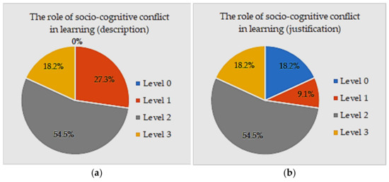 With respect to the description of the role of socio-cognitive conflict in learning (Figure 3a), 27.3% of the groups (3 out of 11) did not obtain a satisfactory level of achievement (levels 0 and 1). All of them made a vague and superficial description of the role and importance of creating conflict during the learning process. All the groups presented at least one descriptive element about how, when or why socio-cognitive conflict is important in learning. 72.7% of the groups (8 out of 11) obtained a satisfactory level of achievement (levels 2 and 3), and 54.5% of them (6 out of 11 groups) made an in-depth description. However, they did not consider any of the expected elements. An in-depth description that included all the expected elements was provided by 18.2% (2 out of 11).