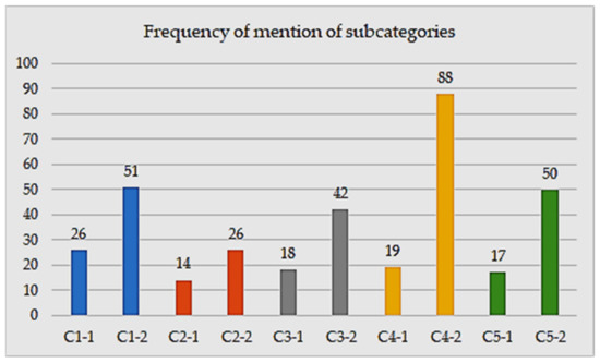 To perform the content analysis, we selected those units that concerned the learning principles related to social interaction elaborated by the participants. The data of each group were freely coded in accordance with how they identified, described and justified this learning principle. This enabled building emerging categories and arranging the students’ reports into those categories following an iterative coding process. During this coding process, through grouping by units of meaning, different categories and indicators emerged that were refined during and after the subsequent analysis [66], following the meaning condensation method proposed by [67]. A total of five categories (C1–C5) were constituted. For each category, two dimensions related to identification and description were taken into account. A total of ten subcategories (C1-1, C5-2) (Table 1) and 33 indicators were obtained from the five categories.