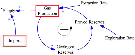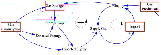 In the gas supply subsystem, similar to the gas consumption demand subsystem, the variables are linked by the causal relationships shown in Figure 3. Gas production, geological reserves and preserved reserves form a negative feedback loop, which is indicated by the ‘-’ sign with an arrow circle in the middle of the loop. The exploration rate determines the annual proved reserves, and the annual gas production depends on the gas extraction rate. These two technical factors were estimated from the historical data. By combining the gas storage subsystem and demand subsystem, increasing gas storage and consumption demands would require more imports. Domestic gas production and imports together provide the total gas supply capacity.