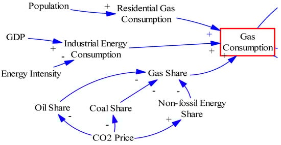 Figure 2 shows the main variables in the gas demand subsystem, which are linked by causal relationships. The total domestic gas consumption consists of residential consumption and economic industrial consumption. Residential gas consumption is mainly generated by the urban population and is determined by the total population and urbanization rate. The birth and death rates determine the population growth rate. GDP growth requires more energy, and a reduction in energy intensity will help to reduce energy consumption. Natural gas and other energy sources have a mutual substitution relationship. Reductions in the proportions of other energy sources (including coal, oil, renewable energy, etc.) will increase the proportion of natural gas used. China began piloting the domestic carbon trading market in 2011. With the gradual improvement of the carbon trading system, increases in carbon prices will inhibit the use of fossil energy and promote the transition to clean energy.