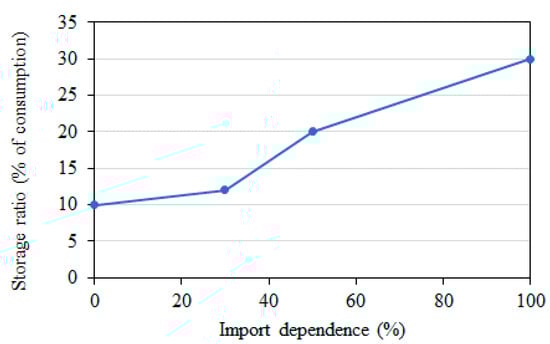 The data for the developed countries shows that the gas storage scale usually accounts for 15–30% of annual gas consumption. This value reaches approximately 17% in the U.S., 15% in Russia, approximately 22% in Germany and 30% in France [5,34]. Generally, a higher level of external dependence requires a higher storage ratio. According to the summary of [35], we assumed that the relationship between the storage ratio and degree of import dependence is as shown in Figure 4. That is, the storage ratio needs to reach 12% when the import dependency exceeds 30% and should be at least 20% when the import dependency exceeds 50%. When almost all gas is dependent on imports, the storage ratio should reach more than 30%. There is no clear evidence regarding when the storage plan started in China, and reliable storage data before 2017 are not available; thus, we assumed that the amount of gas storage was zero before 2017 and that the storage plan was implemented in 2017. A storage buffer period of 5 years was defined to achieve the storage target. A 5-year period was adopted because China typically uses 5-year periods to achieve its goals and plans, such as the “14 Five-Year Plan”.