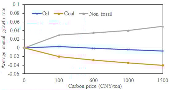 Fossil energy consumption produces greenhouse gas emissions and harms the climate and the environment. More and more countries have introduced environmental policies to promote the use of green energy [36]. In the context of carbon neutrality, China has introduced policies and measures such as “coal to gas” to promote this energy transition, and at the same time, it is gradually improving the carbon trading market to adjust the energy structure. Higher carbon price is considered to promote the replacement of high-carbon energy by clean energy [30]. In this article, carbon price is assumed to be a linear function of the growth rate of each energy share. By referring to the results of Wang [37] (which measured the impact of changes in carbon prices on China’s energy substitution from the perspective of energy equipment capacity investment), we estimated the relationship between carbon prices and the growth rate of energy share. As shown in Figure 5, the data pairs for coal are (100,−0.02), (600,−0.028), (1000,−0.035) and (1500,−0.04); for oil: (100,0.0033), (600,−0.001), (1000,−0.004) and (1500,−0.007); and for non-fossil energy: (100,0.03), (600,0.035), (1000,0.04) and (1500,0.05). The average carbon price in China’s pilot market basically fluctuates between 20 and 80 CNY/ton (Data from Shanghai Environment and Energy Exchange). The national carbon market of China was just established in July 2021, and the carbon price is floating around 50 CNY/ton. Thus, the carbon price in the model for the base case is set to 50 CNY/ton. With the establishment of China’s national carbon market, under the pressure of carbon neutrality, carbon price is believed to rise in the future.