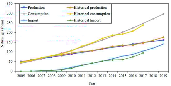The model simulation period is 2005–2060, where 2005–2019 is the check period and 2021–2035 is the forecast period. Most of the historical data before 2019 were obtained from the National Bureau of Statistics of China and China Statistical Yearbook 2020 [39]. Figure 6 shows the simulation results of our model and the historical data for gas consumption, production and imports, which are also listed in Appendix B. By using the Mean Absolute Percentage Error (MAPE) method, the error accuracy of the simulated consumption, production and imports is 2.1%, 1.8% and 9.1%, respectively, which means the simulation results fit well with the historical data.