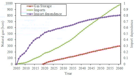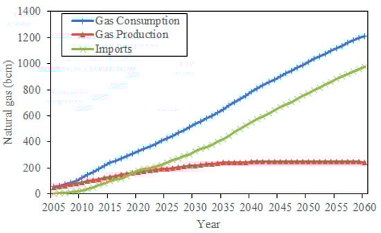 (2) The remainder that was technologically recoverable proved natural gas reserves were nearly 197 trillion cubic meters, approximately 50 times that of the extracted part [33]. Considering the very large global reserves, we assume that China’s gas imports have good accessibility to meet the rising demand during the next 40 years. In other words, there are no restrictions on external imports.