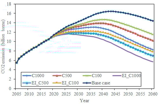 In the base case, the energy intensity growth rate was set to −2%, and the carbon price was 50 RMB. In the next 40 years, a higher energy intensity decline rate of −3% was considered with respect to the future accelerated industrial upgrading of China. To reduce carbon emissions, gas consumption might rise sharply along with its substitution for coal and may also decline due to the growth in renewable energy use. Carbon prices play a key role in the adjustment of the energy structure. Then, by referring to the development of European carbon markets and the high carbon prices, such as Sweden’s carbon price of up to US$125 (about 800 CNY) per ton, we assumed three future carbon price scenarios, namely, 100 RMB/ton, 500 RMB/ton and 1000 RMB/ton, to characterize the low, medium and high levels of environmental constraints, respectively. The corresponding combination scenarios with settings are shown in Table 5.