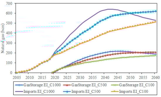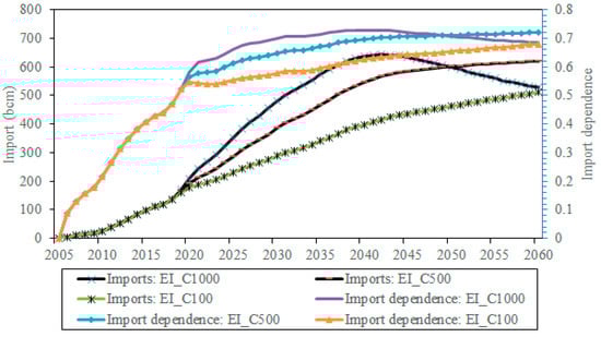Figure 9 shows that an accelerated decline in carbon intensity will help achieve the peak of carbon emissions in 2030, and the high carbon prices will help to achieve the energy transition, increase the proportion of clean energy, reduce carbon emissions per unit of GDP and help to achieve carbon neutrality by 2060. On the whole, EI_C100, EI_C500 and EI_C1000 are more feasible for the carbon neutral route and will be used as the key analysis scenarios. Figure 10 and Figure 11 show the dynamics of natural gas consumption, storage and import demand for the EI_C100, EI_C500 and EI_C1000 cases. In all of three cases, the growth in gas consumption in the next 20 years will be very rapid. In 2030, natural gas consumption will be between 500–690 bcm; storage demand will reach 88–130 bcm; import demand will be 290–480 bcm; and at that time, the import dependence will rise to 58–70% (see Figure 11). In case EI_C1000, natural gas consumption will nearly double and reach a peak at 850 bcm in approximately 2040, and higher renewable energy use will compress the natural gas growth space after 2040. The storage demand will reach a peak in approximately 2045, and then import pressures will drop, but import dependence will still remain at high levels, i.e., above 60% before 2060.