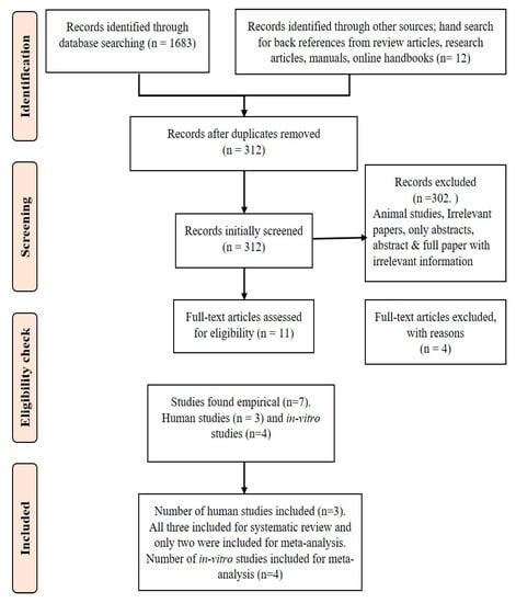 1. Review articles were excluded. 2. Animal studies were excluded. 3. If the data were found incomplete, the authors were contacted. If complete data were still not accessible, then the articles were excluded. 4. Although several articles (312) were obtained during the first screening, only 7 qualified articles were included, other articles which looked related but had information only on nutrient composition of finger millet were rejected.