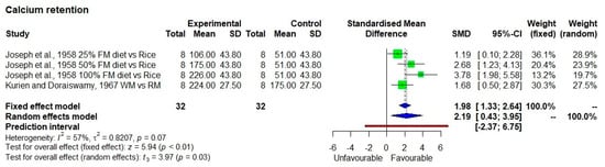 Calcium retention in children was significantly high from finger-millet-based diet (p < 0.05) compared to rice-based diet or refined finger-millet-based diet with moderate heterogeneity (I2 = 57%) among studies with standardized mean difference (SMD) of 2.19 and 95% confidence interval of 0.43; 3.95 (Figure 2). The sample size was 32 and average calcium retention was 23.4 ± 2.9% from finger-millet-based diet. The predication interval lies between −2.37 and 6.75 shows the slight possibility of non-significant results, indicating a need for more studies with high sample numbers.